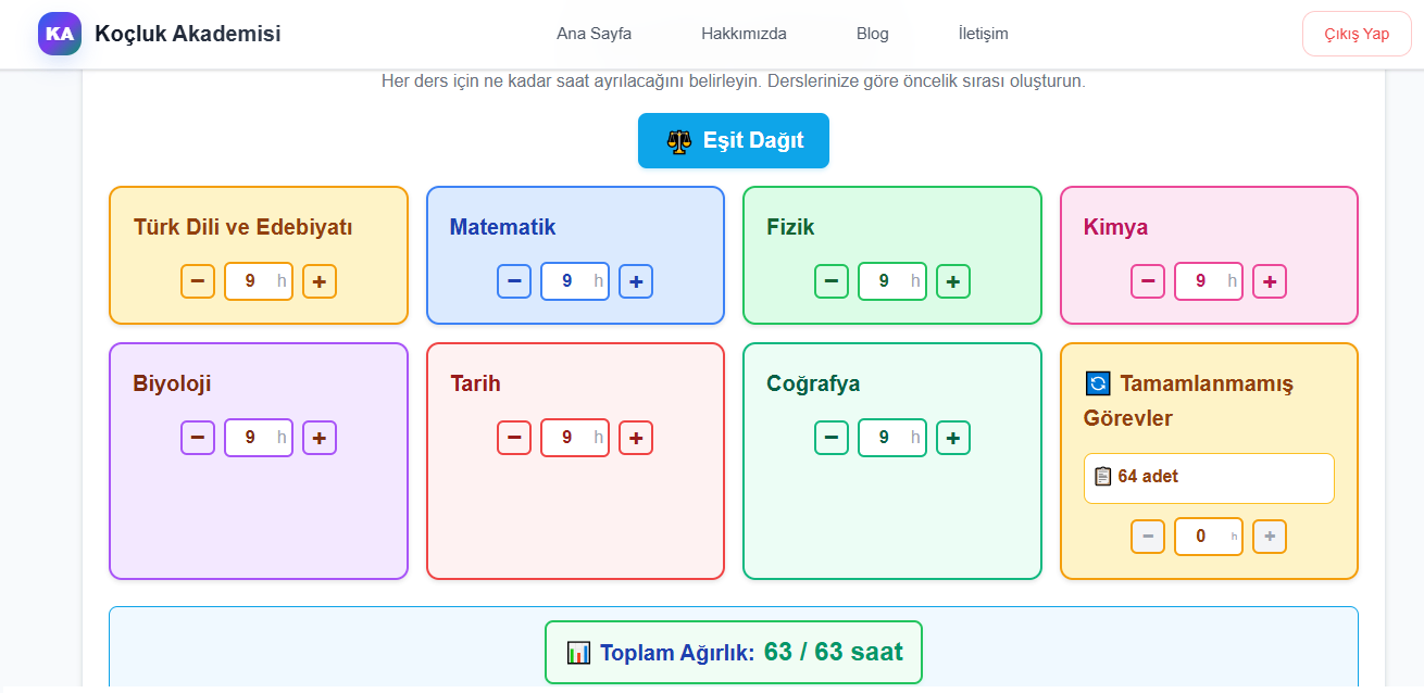 Haftalık plan nasıl yapılır sürecinin ikinci adımı, ders ağırlık düzenlemesidir. Her ders için kaç saat çalışacağınızı belirleyebilir, eşit dağıt butonuna basarak müsait saatlerinizi derslere eşit şekilde dağıtabilirsiniz. Bu adım, haftalık plan nasıl yapılır sorusunun en önemli parçalarından biridir çünkü planın nasıl dağıtılacağını belirler.